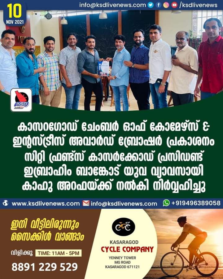 കാസർക്കോഡ് ചേംബർ ഓഫ് കോമേഴ്സ്& ഇൻ്റസ്ട്രീസ് അവാർഡ് ബ്രോഷർ പ്രകാശനം സിറ്റി ഫ്രണ്ട്സ് കാസർക്കോഡ് പ്രസിഡണ്ട് ഇബ്രാഹിം ബാങ്കോട് യുവ വ്യാവസായി കാഹു അറഫയ്ക്ക് നൽകി നിർവ്വഹിച്ചു