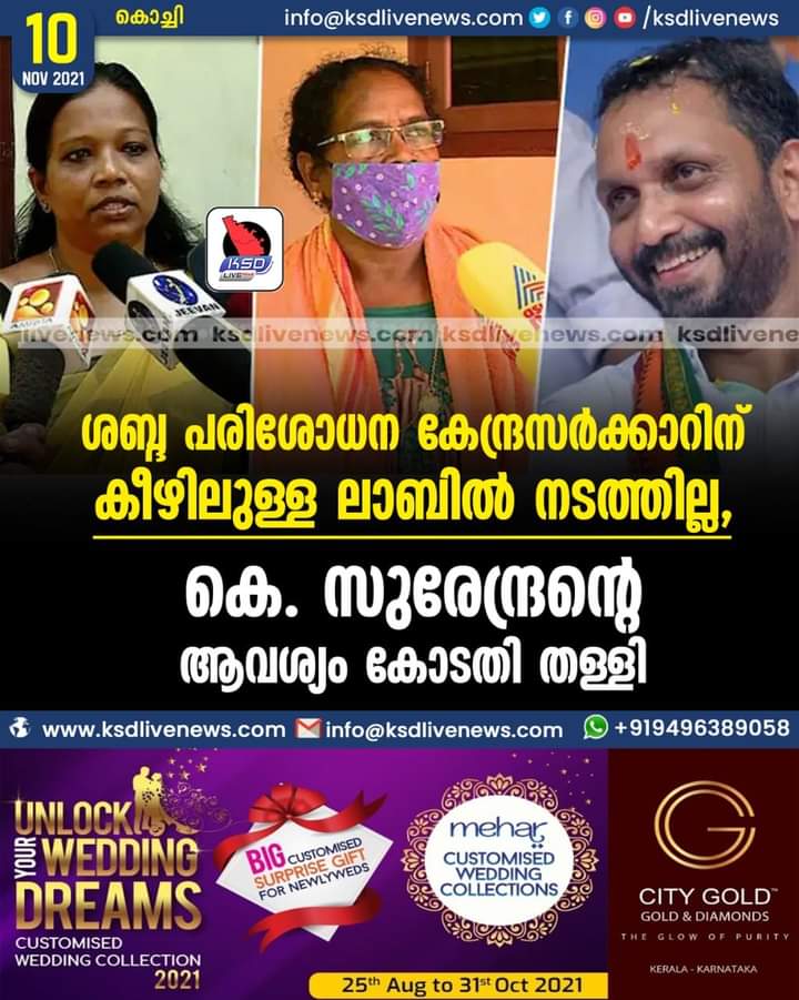 ശബ്ദ പരിശോധന കേന്ദ്ര സർക്കാറിന് കീഴിലുള്ള ലാബിൽ നടത്തില്ല, കെ സുരേന്ദ്രന്റെ ആവശ്യം കോടതി തള്ളി