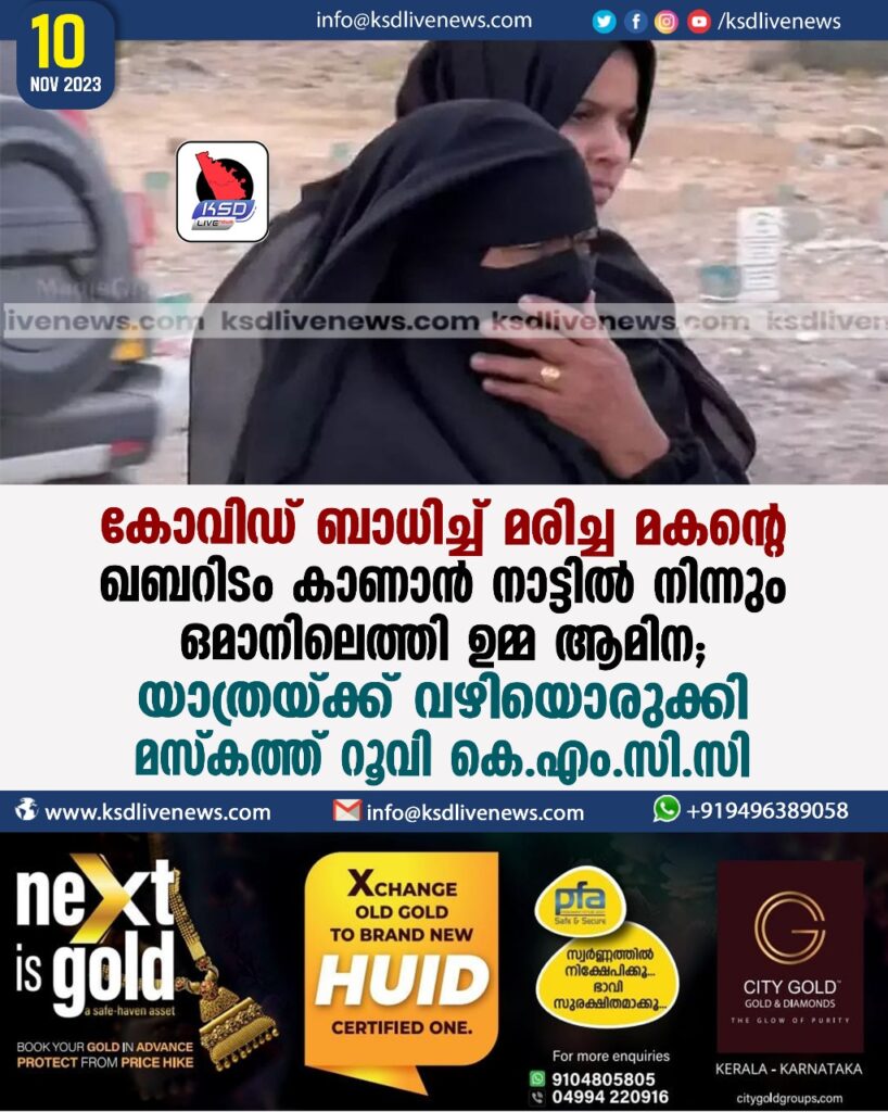 കോവിഡ് ബാധിച്ച് മരിച്ച മകന്റെ ഖബറിടം കാണാൻ നാട്ടിൽ നിന്നും ഒമാനിലെത്തി ഉമ്മ ആമിന; യാത്രയ്ക്ക് വഴിയൊരുക്കി മസ്കത്ത് റൂവി കെ.എം.സി.സി