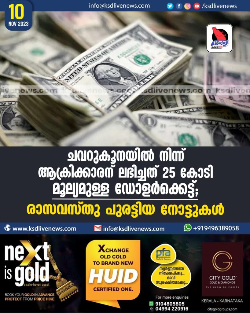 ബെംഗളൂരു ∙ ചവറുകൂനയിൽനിന്ന് ആക്രി പെറുക്കുന്നയാൾക്കു  ലഭിച്ചത് 25 കോടി രൂപ വിലമതിക്കുന്ന യുഎസ് ഡോളർ. നവംബർ ഒന്നിനാണ് ബെംഗളൂരുവിൽനിന്ന് സൽമാൻ ഷെയ്ക് എന്നയാൾക്ക് യുഎസ് ഡോളർ അടങ്ങിയ 23 കെട്ടുകൾ ലഭിച്ചത്. അപ്രതീക്ഷിതമായി ഇത്രയും പണം കിട്ടിയതിന്റെ ഞെട്ടലിൽ സൽമാൻ ഇത് എന്തുചെയ്യണമെന്ന് അറിയാതെ കുറച്ചു ദിവസം കയ്യിൽവച്ചു. നവംബർ അഞ്ചിന് തന്റെ മുതലാളിയായ ബാപായോട് കാര്യം പറഞ്ഞു. സാമൂഹികപ്രവർത്തകനായ കാളി മുല്ലയെ ബാപാ ഇക്കാര്യം ചർച്ച ചെയ്യുകയും അയാൾ പൊലീസ് കമ്മിഷണറെ ബന്ധപ്പെടുകയുമായിരുന്നു. തുടർന്ന് ഇവരെ പൊലീസ് വിളിപ്പിച്ച് ചോദ്യം ചെയ്തു. ഹെബ്ബൽ  പൊലീസ് സ്റ്റേഷനിൽ ഇതു സംബന്ധിച്ച് അന്വേഷണം നടന്നുവരികയാണ്. നോട്ടുകളിൽ രാസവസ്തുക്കൾ പുരട്ടിയിട്ടുണ്ട്. ഇത് ഡോളർ കള്ളക്കടത്തു സംഘത്തിന്റേതാകുമെന്നാണ് പൊലീസ് വിലയിരുത്തൽ. നോട്ടുകൾ വ്യാജമാണോ എന്ന് അറിയാൻ റിസർവ് ബാങ്ക് ഓഫ് ഇന്ത്യയെ സമീപിച്ചിട്ടുണ്ട്