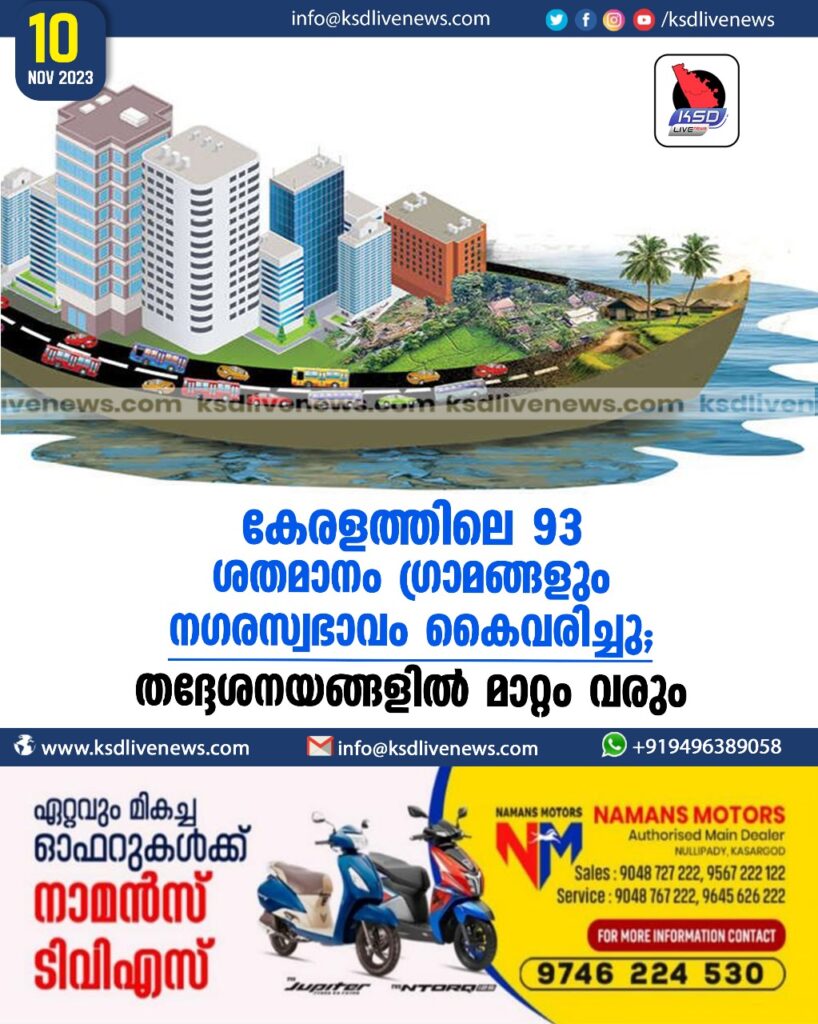 കേരളത്തിലെ 93 ശതമാനം ഗ്രാമങ്ങളും നഗരസ്വഭാവം കൈവരിച്ചു; തദ്ദേശനയങ്ങളില് മാറ്റം വരും