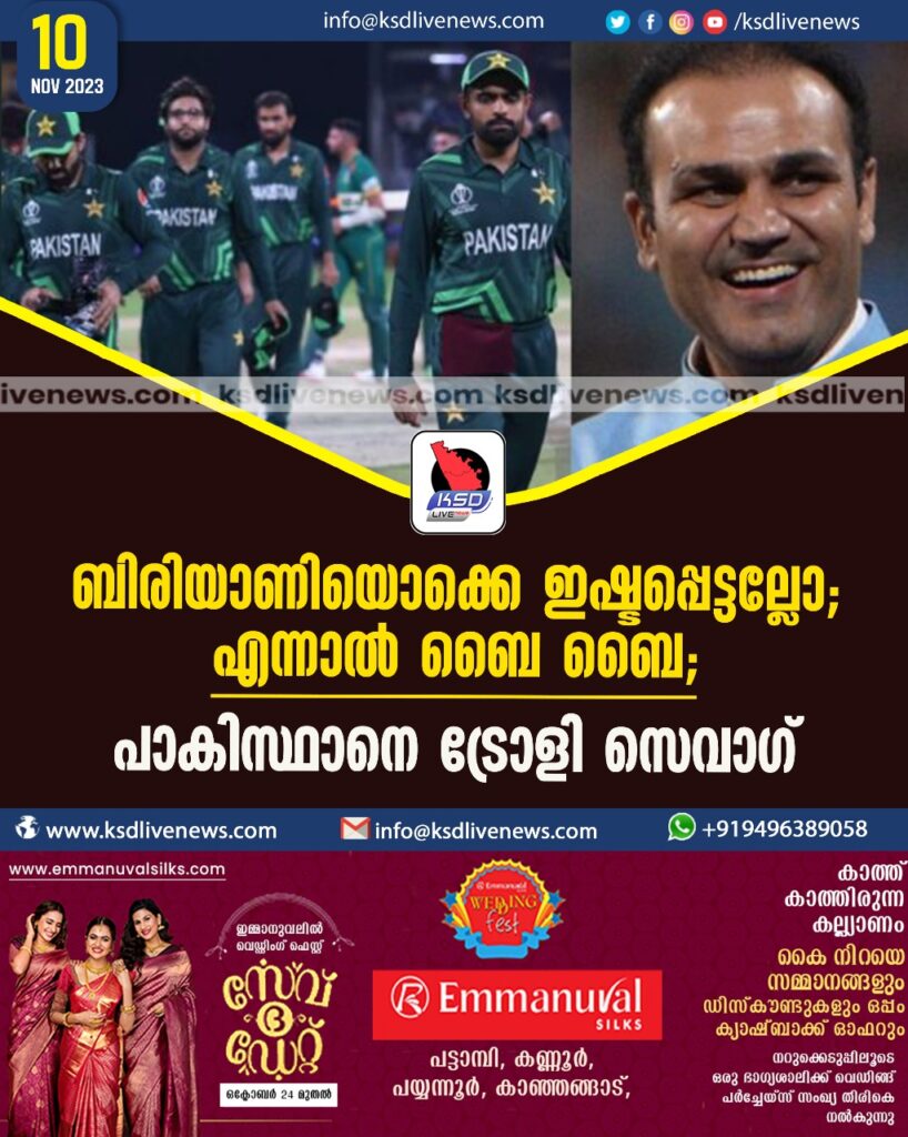 ബിരിയാണിയൊക്കെ ഇഷ്ടപ്പെട്ടല്ലോ?; എന്നാല് ബൈ ബൈ; പാകിസ്ഥാനെ ട്രോളി സെവാഗ്
