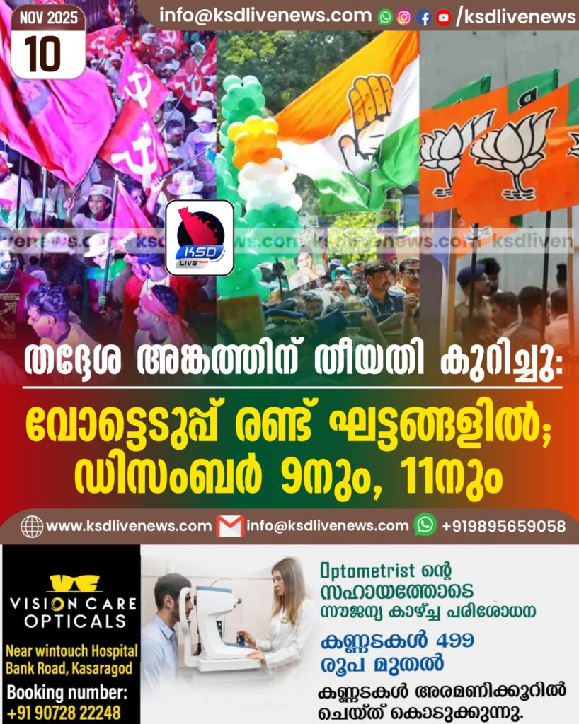 തദ്ദേശ അങ്കത്തിന് തീയതി കുറിച്ചു: വോട്ടെടുപ്പ് രണ്ട് ഘട്ടങ്ങളില്; ഡിസംബര് 9നും, 11നും