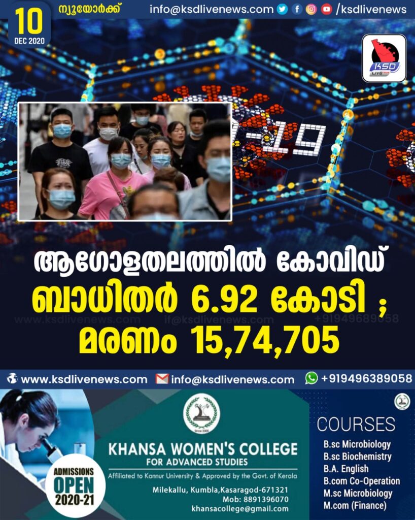 ആഗോളതലത്തിൽ കോവിഡ് ബാധിതർ 6.92 കോടി ; മരണം 15,74,705