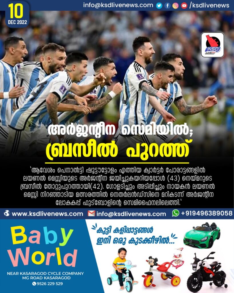 ദോഹ: ആവേശം പെനാല്ട്ടി ഷൂട്ടൗട്ടോളം എത്തിയ ക്വാര്ട്ടര് പോരാട്ടങ്ങളില് ലയണല് മെസ്സിയുടെ അര്ജന്റീന ജയിച്ചുകയറിയപ്പോള് (4-3) നെയ്മറുടെ ബ്രസീല് തോറ്റുപുറത്തായി(4-2). ഗോളടിച്ചും അടിപ്പിച്ചും നായകന് ലയണല് മെസ്സി നിറഞ്ഞാടിയ മത്സരത്തില് നെതര്ലന്ഡ്സിനെ മറികടന്ന് അര്ജന്റീന ലോകകപ്പ് ഫുട്ബോളിന്റെ സെമിഫൈനലിലെത്തി. മറ്റൊരു മത്സരത്തില് നെയ്മറുടെ ഗോളിന് ബ്രസീലിനെ രക്ഷിക്കാനായില്ല. ക്രൊയേഷ്യയോടു തോറ്റ് ബ്രസീല് ലോകകപ്പില്നിന്നു പുറത്തായി. ചൊവ്വാഴ്ച രാത്രി 12.30-ന് ആദ്യ സെമിയില് അര്ജന്റീന ക്രൊയേഷ്യയെ നേരിടും.