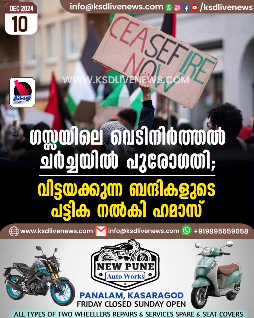 ഗസ്സയിലെ വെടിനിര്ത്തല് ചര്ച്ചയില് പുരോഗതി; വിട്ടയക്കുന്ന ബന്ദികളുടെ പട്ടിക നല്കി ഹമാസ്