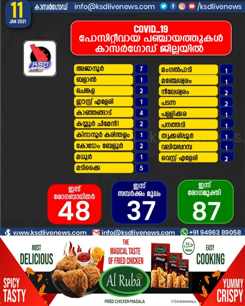 കാസർഗോഡ് ജില്ലയിൽ ഇന്ന് കോവിഡ് സ്ഥിരീകരിച്ചവരുടെ പഞ്ചായത്ത് തിരിച്ചുള്ള സ്ഥിതി വിവര കണക്ക്