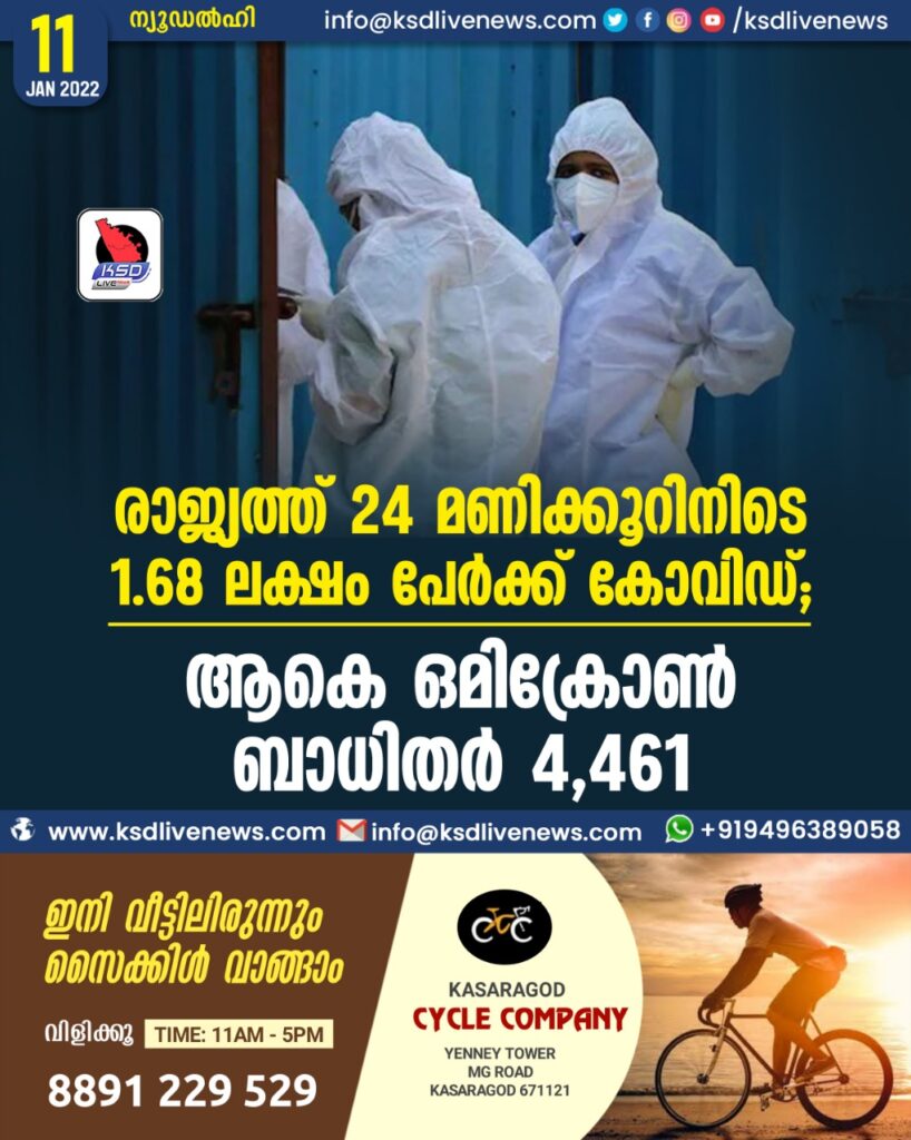 രാജ്യത്ത് 24 മണിക്കൂറിനിടെ 1.68 ലക്ഷം പേർക്ക് കോവിഡ് ; ആകെ ഒമിക്രോൺ ബാധിതർ 4,461