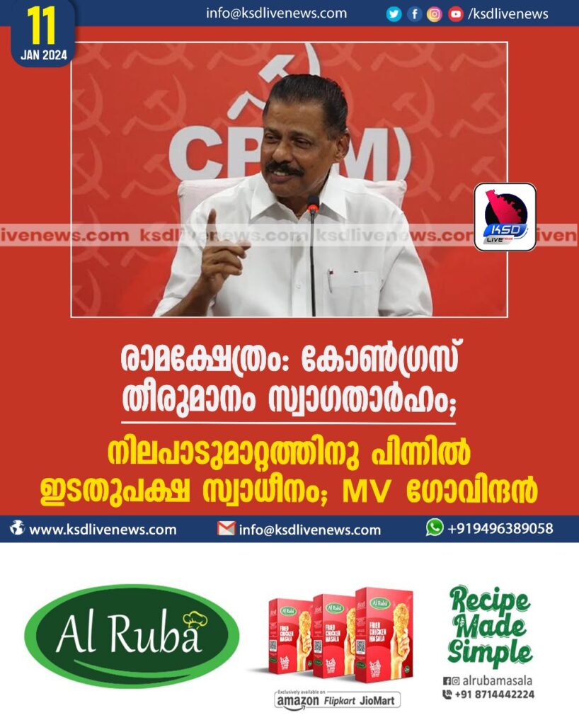 രാമക്ഷേത്രം: കോൺഗ്രസ് തീരുമാനം സ്വാഗതാർഹം, നിലപാടുമാറ്റത്തിനു പിന്നിൽ ഇടതുപക്ഷ സ്വാധീനം- MV ഗോവിന്ദൻ