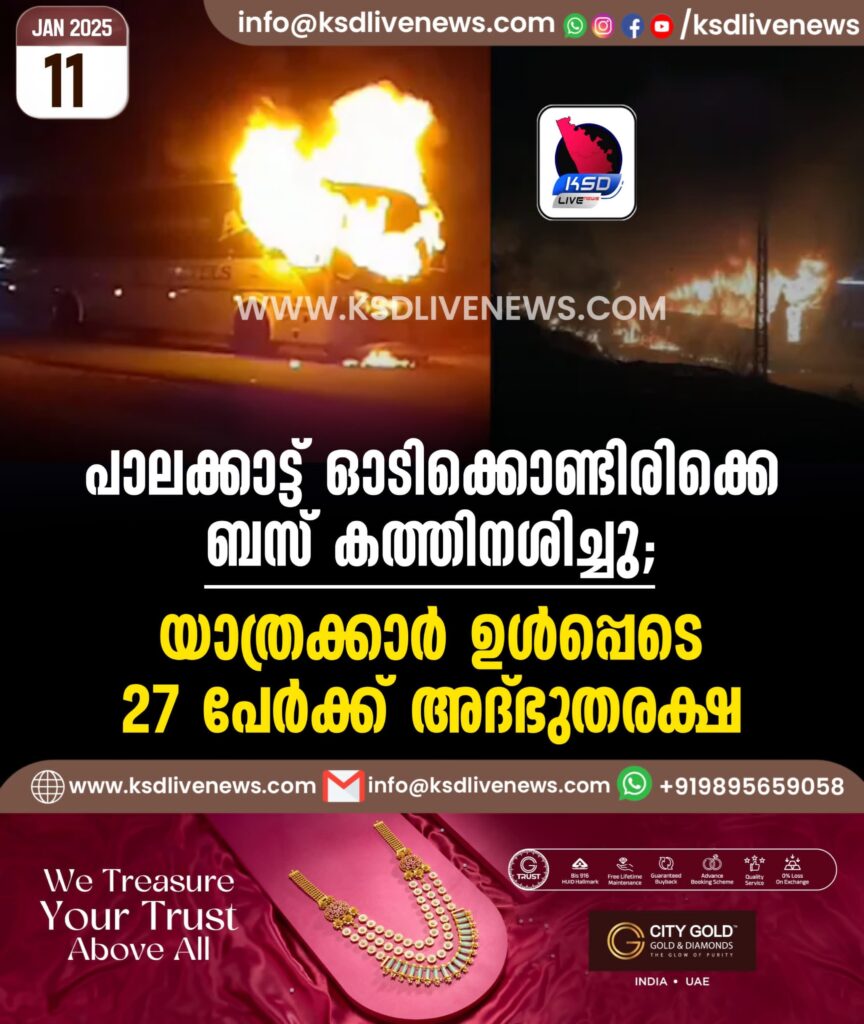 പാലക്കാട്ട് ഓടിക്കൊണ്ടിരിക്കെ ബസ് കത്തിനശിച്ചു; യാത്രക്കാർ ഉൾപ്പെടെ 27 പേർക്ക് അദ്ഭുതരക്ഷ