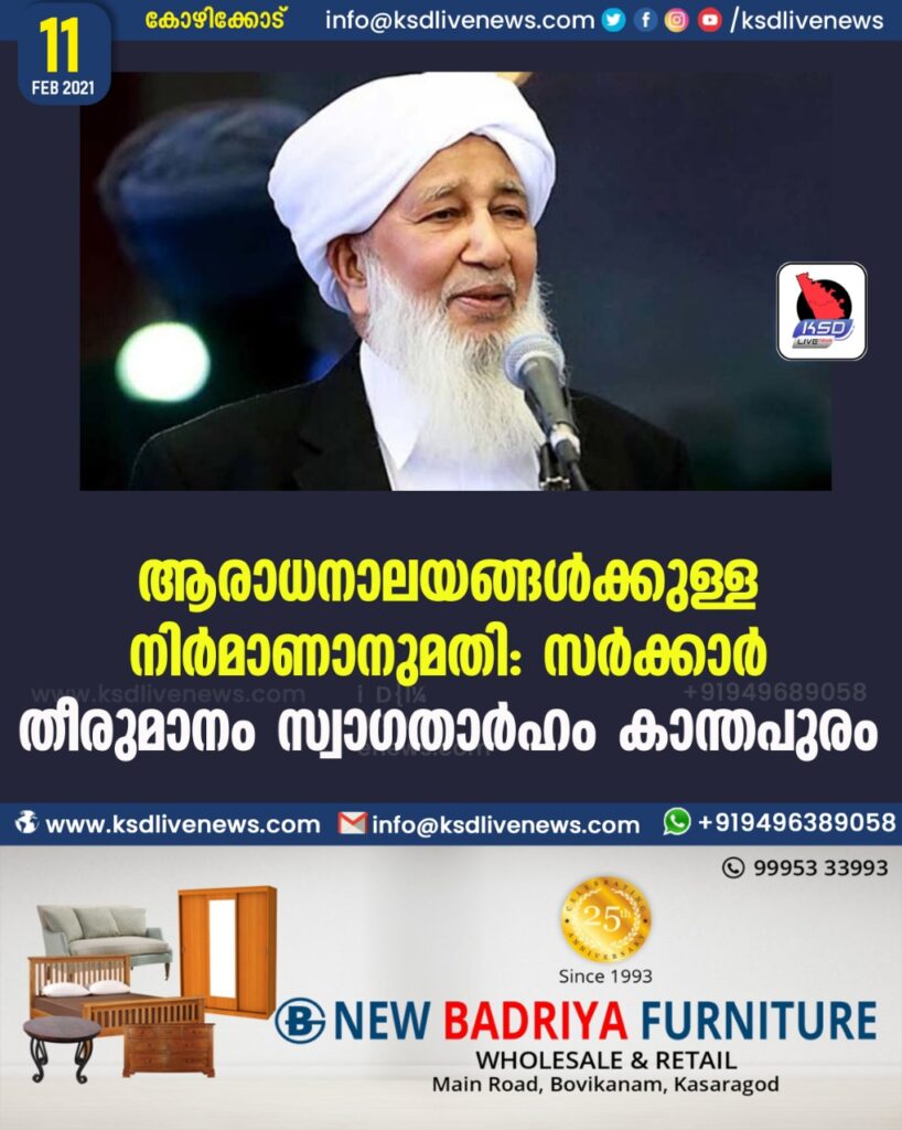 ആരാധനാലയങ്ങള്ക്കുള്ള നിര്മാണാനുമതി: സര്ക്കാര് തീരുമാനം സ്വാഗതാര്ഹം- കാന്തപുരം