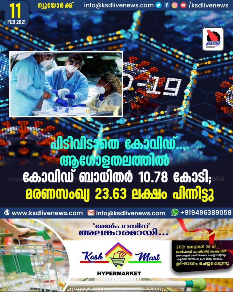 ആഗോളതലത്തിൽ കോവിഡ് ബാധിതർ 10.78 കോടി; മരണസംഖ്യ 23.63 ലക്ഷം പിന്നിട്ടു