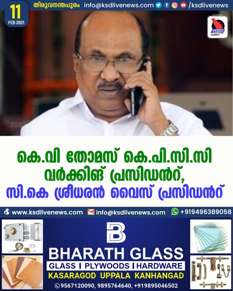 കെ.വി തോമസ് കെ.പി.സി.സി വര്ക്കിങ് പ്രസിഡന്റ്, സി.കെ ശ്രീധരന് വൈസ് പ്രസിഡന്റ്