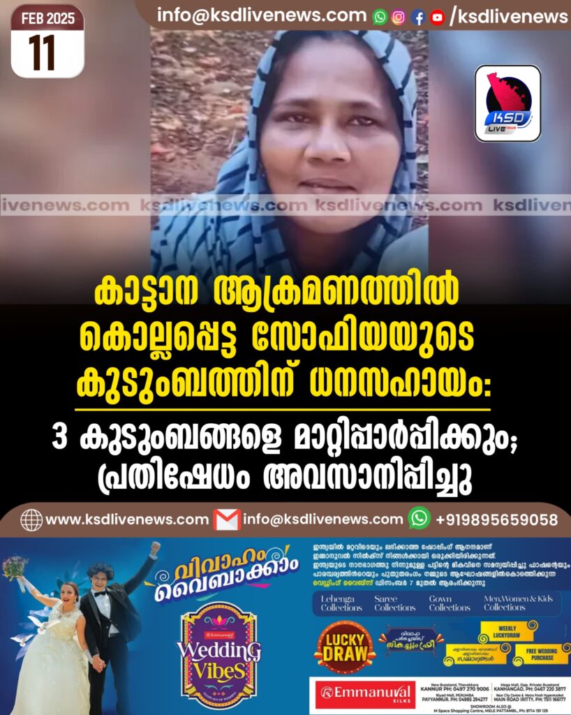 കാട്ടാന ആക്രമണത്തിൽ കൊല്ലപ്പെട്ട സോഫിയയുടെ കുടുംബത്തിന് ധനസഹായം, 3 കുടുംബങ്ങളെ മാറ്റിപ്പാർപ്പിക്കും; പ്രതിഷേധം അവസാനിപ്പിച്ചു