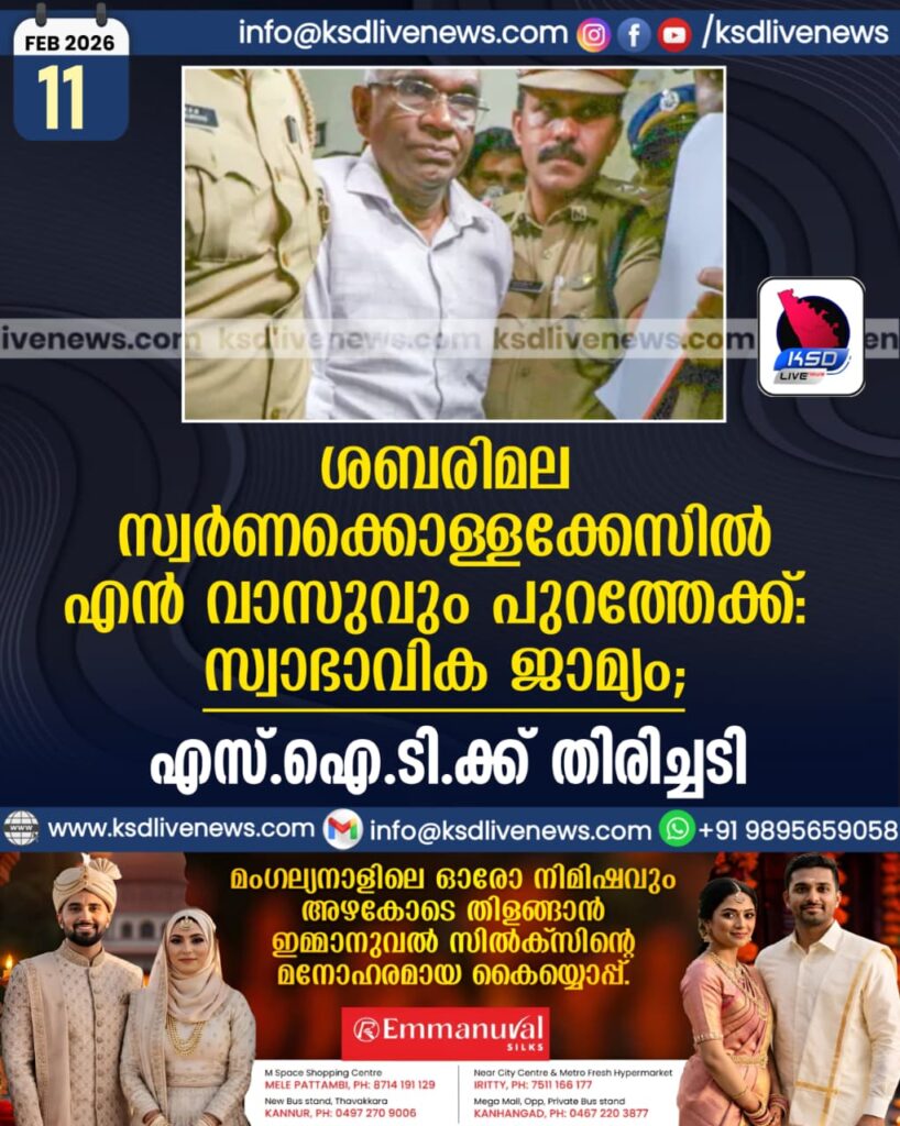 ശബരിമല സ്വർണക്കൊള്ളക്കേസിൽ എൻ. വാസുവും പുറത്തേക്ക്: സ്വാഭാവിക ജാമ്യം; എസ്.ഐ.ടി.ക്ക് തിരിച്ചടി