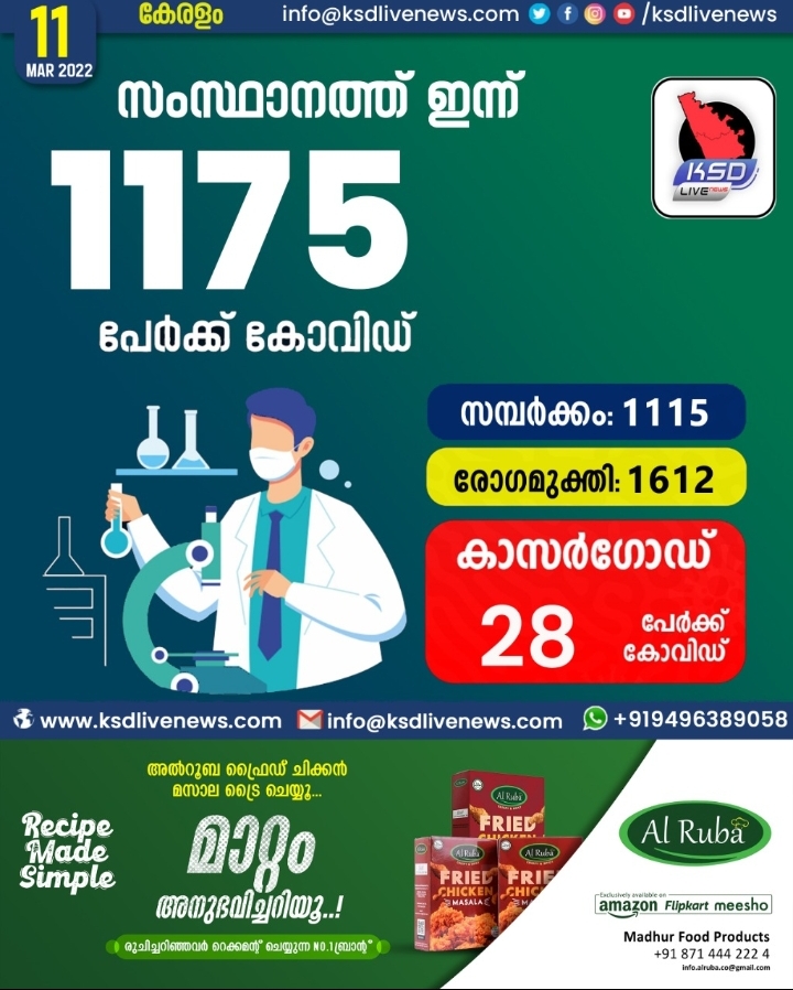 സംസ്ഥാനത്ത് ഇന്ന് 1175 കോവിഡ് സ്ഥിരീകരിച്ചു. സമ്പർക്കം വഴി 1115 പേർക്കും ; ആശ്വാസമായി 1612 പേർക്ക് രോഗമുക്തി ; കാസർഗോഡ് ജില്ലയിൽ 28 പേർക്ക് പുതിയ കോവിഡ് കേസുകൾ ; മരണം 02