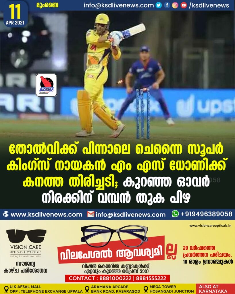 തോല്വിക്ക് പിന്നാലെ ചെന്നൈ സൂപര് കിംഗ്സ് നായകന് എം എസ് ധോണിക്ക് കനത്ത തിരിച്ചടി; കുറഞ്ഞ ഓവര് നിരക്കിന് വമ്പന് തുക പിഴ