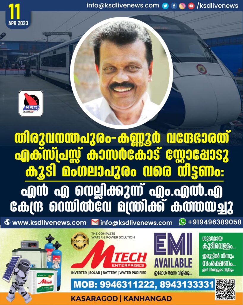 തിരുവനന്തപുരം – കണ്ണൂര് വന്ദേഭാരത് എക്സ്പ്രസ്സ് കാസര്കോട് സ്റ്റോപ്പോടു കൂടി മംഗലാപുരം വരെ നീട്ടണം: എന് എ നെല്ലിക്കുന്ന് എം.എല്.എ കേന്ദ്ര റെയില്വേ മന്ത്രിക്ക് കത്തയച്ചു