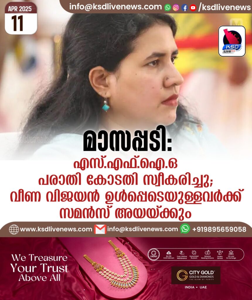 മാസപ്പടി; എസ്എഫ്ഐഒ പരാതി കോടതി സ്വീകരിച്ചു; വീണ വിജയന് ഉള്പ്പെടെയുള്ളവര്ക്ക് സമന്സ് അയയ്ക്കും