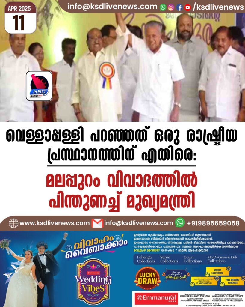 വെള്ളാപ്പള്ളി പറഞ്ഞത് ഒരു രാഷ്ട്രീയ പ്രസ്ഥാനത്തിന് എതിരെ: മലപ്പുറം വിവാദത്തിൽ പിന്തുണച്ച് മുഖ്യമന്ത്രി