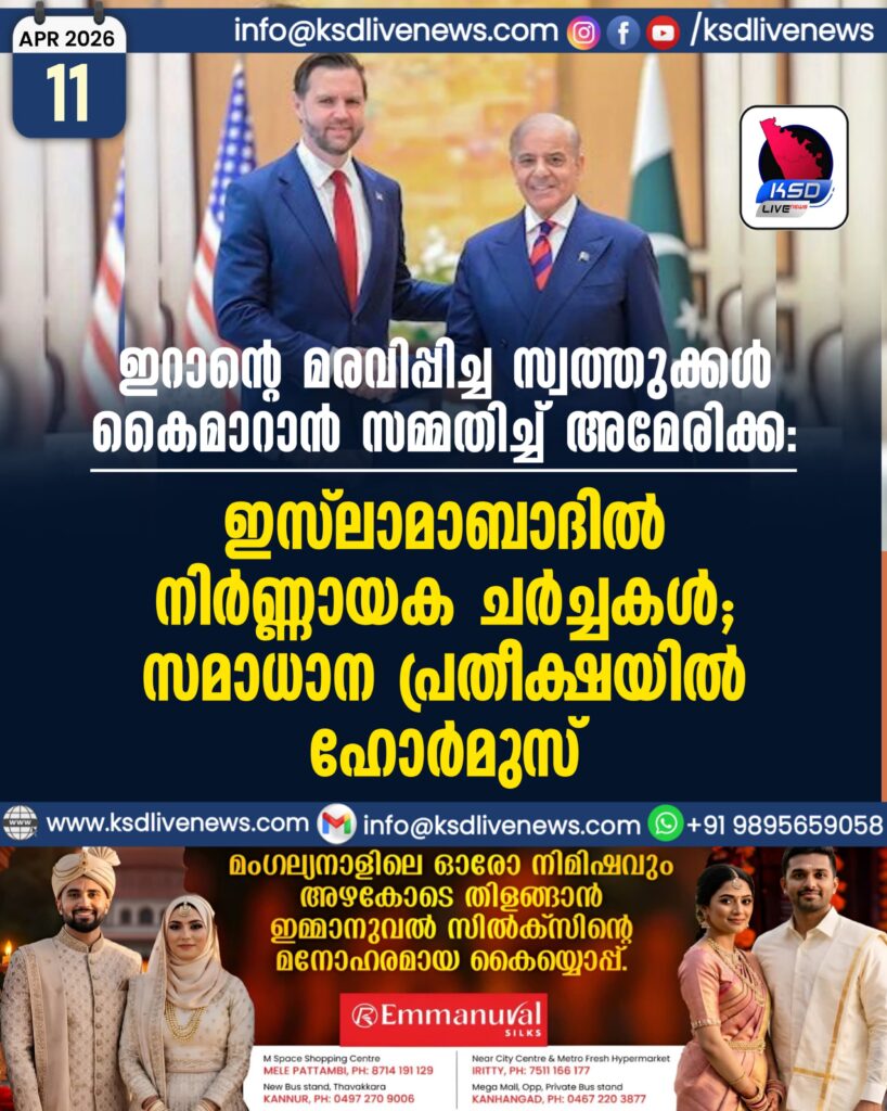 ഇറാന്റെ മരവിപ്പിച്ച സ്വത്തുക്കൾ കൈമാറാൻ സമ്മതിച്ച് അമേരിക്ക; ഇസ്‌ലാമാബാദിൽ നിർണ്ണായക ചർച്ചകൾ, സമാധാന പ്രതീക്ഷയിൽ ഹോർമുസ്