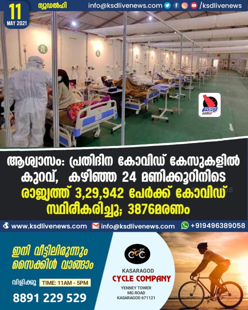 ആശ്വാസം: പ്രതിദിന കോവിഡ് കേസുകളില്‍ കുറവ്‌, കഴിഞ്ഞ 24 മണിക്കൂറിനിടെ രാജ്യത്ത് 3,29,942 പേർക്ക് കോവിഡ് സ്ഥിരീകരിച്ചു; 3876 മരണം