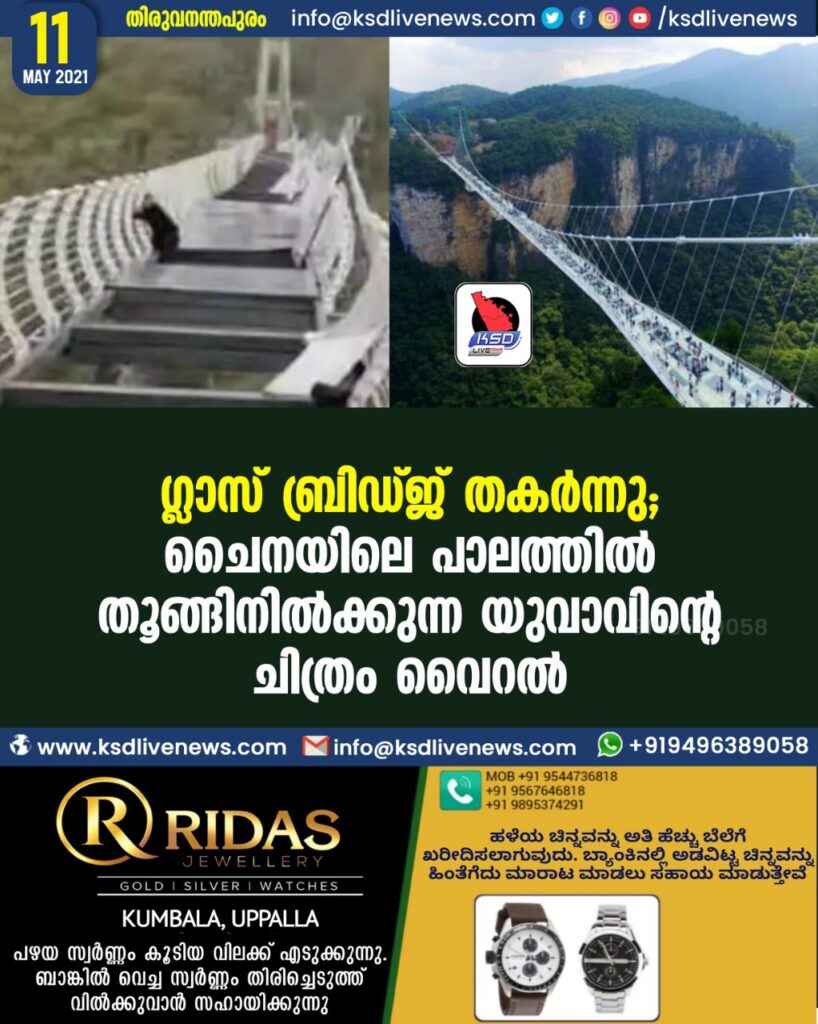 ഗ്ലാസ് ബ്രിഡ്ജ് തകര്ന്നു; ചൈനയിലെ പാലത്തില് തൂങ്ങിനില്ക്കുന്ന യുവാവിന്റെ ചിത്രം വൈറല്