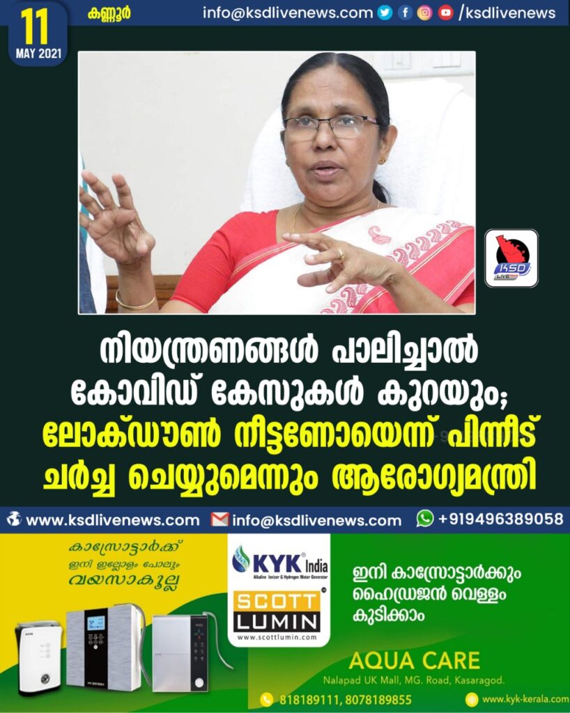 നിയന്ത്രണങ്ങള് പാലിച്ചാല് കോവിഡ് കേസുകള് കുറയും; ലോക്ഡൗണ് നീട്ടണോയെന്ന് പിന്നീട് ചര്ച്ച ചെയ്യുമെന്നും ആരോഗ്യമന്ത്രി