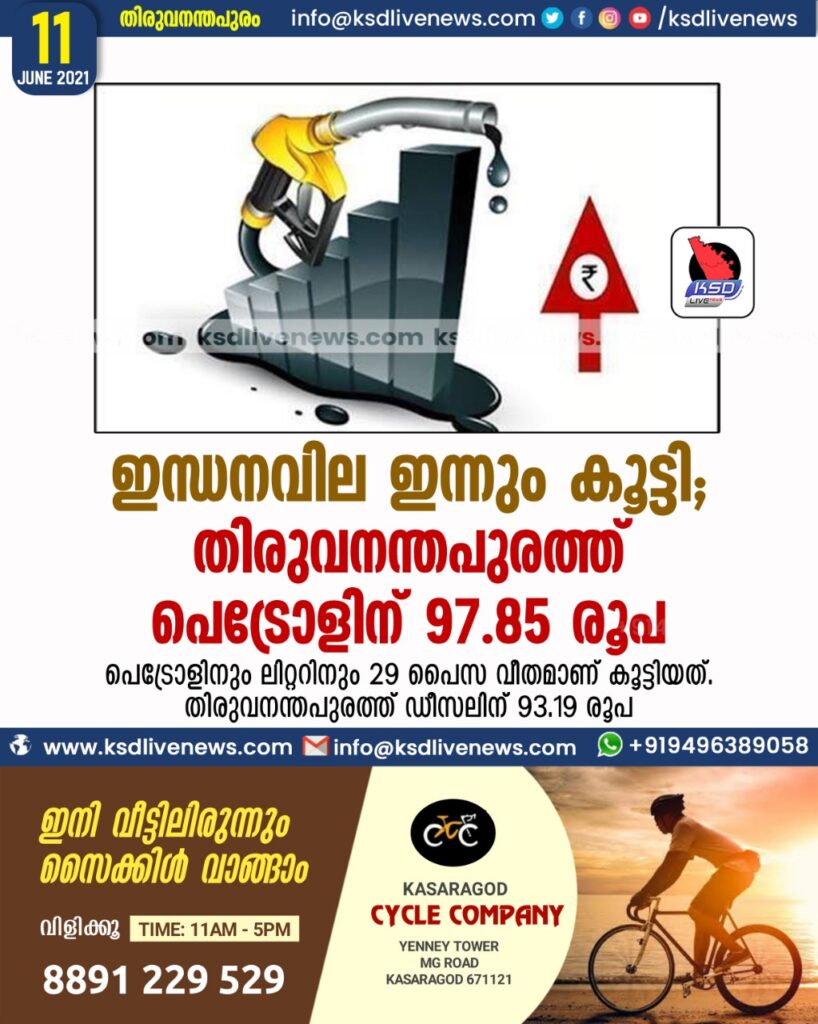 ഇന്ധനവില ഇന്നും കൂട്ടി; തിരുവനന്തപുരത്ത് പെട്രോളിന് 97.85 രൂപ