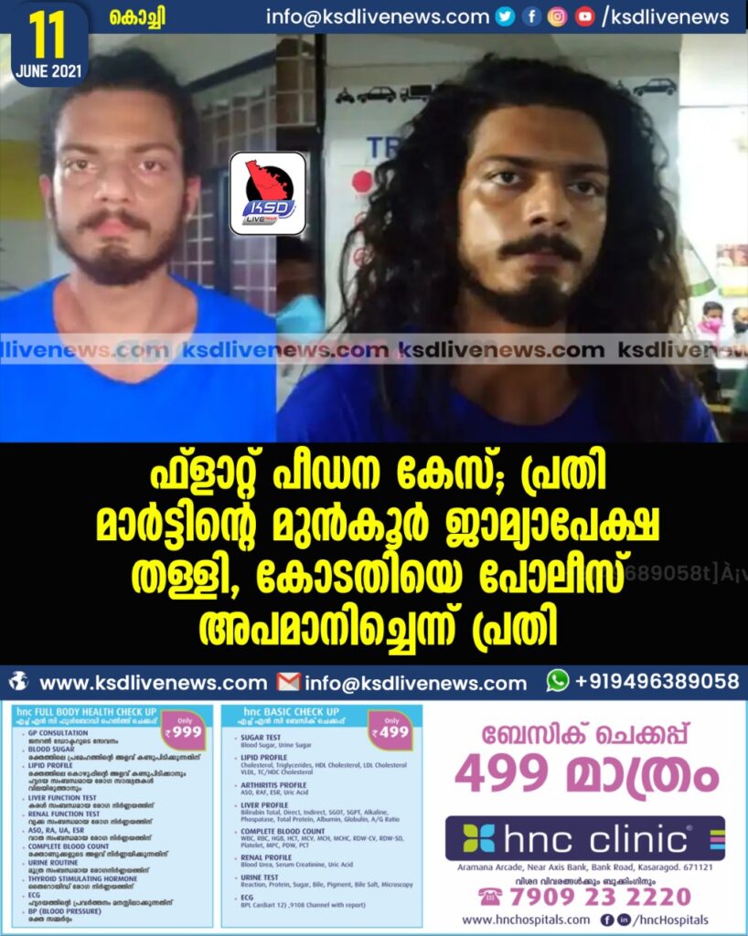ഫ്ലാറ്റ് പീഡന കേസ്; പ്രതി മാര്‍ട്ടിന്‍റെ മുന്‍കൂര്‍ ജാമ്യാപേക്ഷ  തള്ളി, കോടതിയെ പൊലീസ് അപമാനിച്ചെന്ന് പ്രതി
