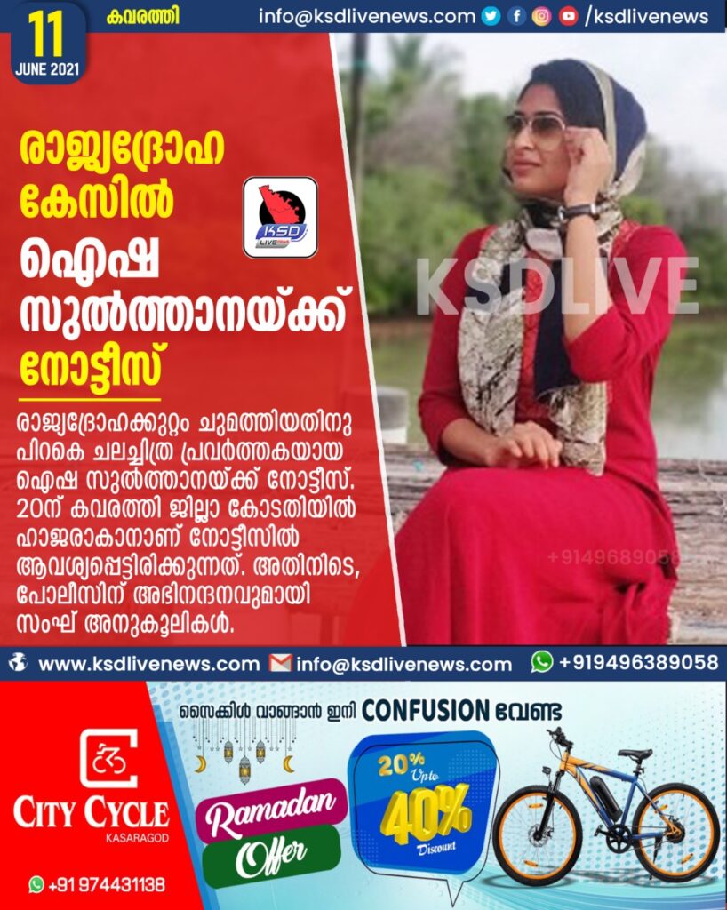 രാജ്യദ്രോഹക്കേസില് ഐഷ സുല്ത്താനയ്ക്ക് നോട്ടീസ്