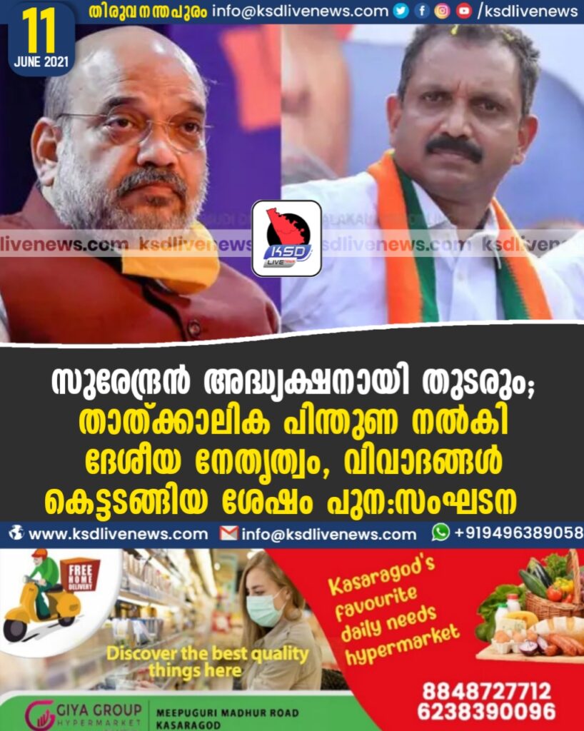 സുരേന്ദ്രന് അദ്ധ്യക്ഷനായി തുടരും; താത്ക്കാലിക പിന്തുണ നല്കി ദേശീയ നേതൃത്വം, വിവാദങ്ങള് കെട്ടടങ്ങിയ ശേഷം പുന:സംഘടന