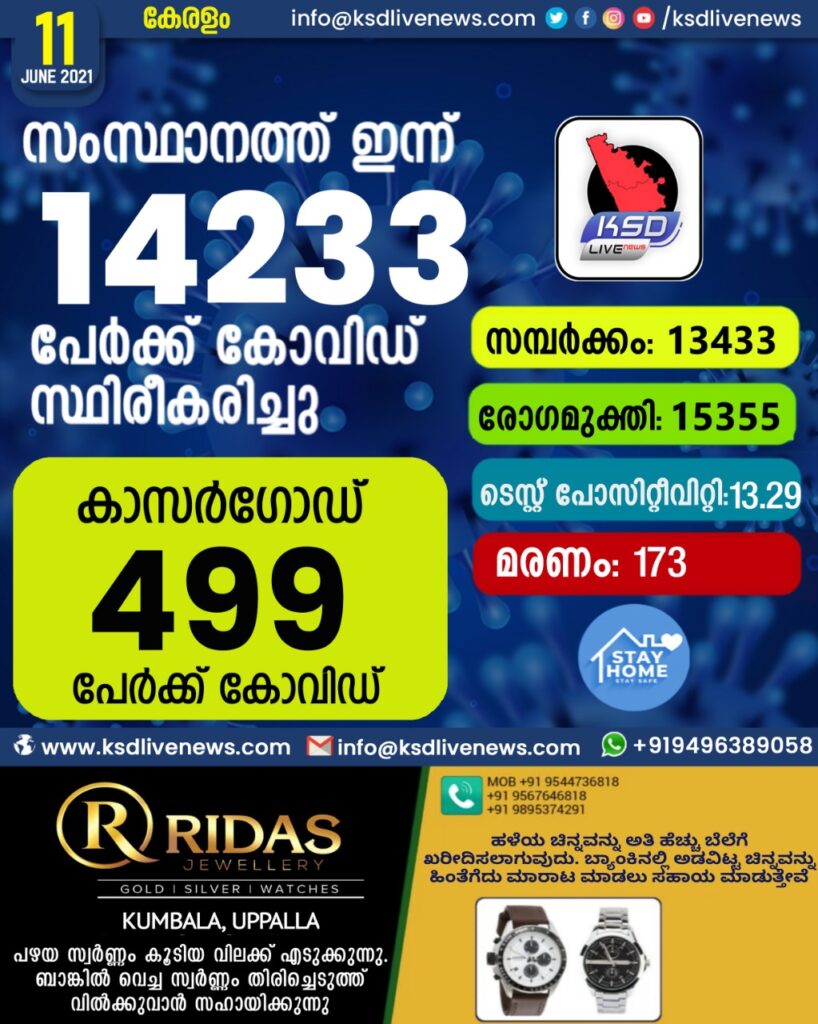 സംസ്ഥാനത്ത് ഇന്ന് 14233 പേർക്ക് കോവിഡ് സ്ഥിരീകരിച്ചു. സമ്പർക്കം വഴി 13433 പേർക്കും ; ആശ്വാസമായി 15355 പേർക്ക് രോഗ മുക്തിയും ; കാസർഗോഡ് ജില്ലയിൽ 499 പേർക്ക് പുതിയ കോവിഡ് കേസുകൾ ; മരണം 173
