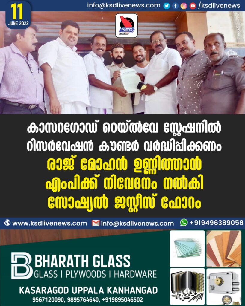 കാസറഗോഡ് റെയ്ൽവേ സ്റ്റേഷനിൽ റിസർവേഷൻ കൗണ്ടർ വർദ്ധിപ്പിക്കണം രാജ് മോഹൻ ഉണ്ണിത്താൻ എം പി ക്ക് നിവേദനം നൽകി സോഷ്യൽ ജസ്റ്റീസ് ഫോറം