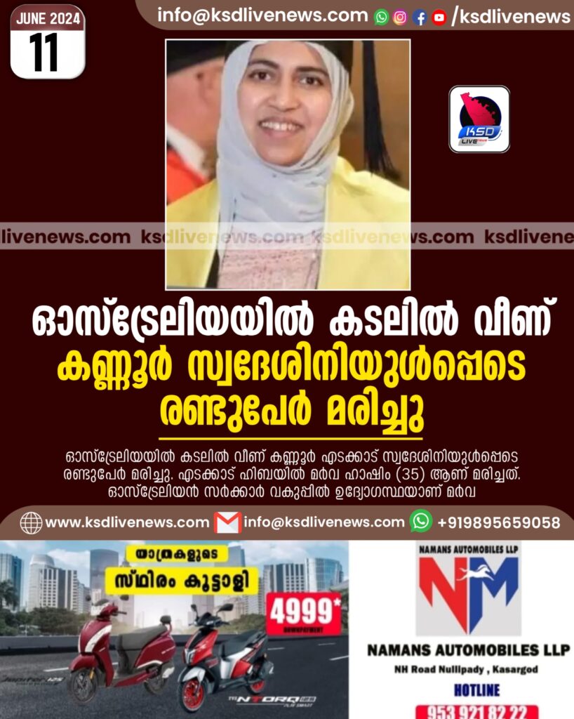 എടക്കാട്: ഓസ്ട്രേലിയയിൽ കടലിൽ വീണ് കണ്ണൂർ എടക്കാട് സ്വദേശിനിയുൾപ്പെടെ രണ്ടുപേർ മരിച്ചു. എടക്കാട് ഹിബയിൽ മർവ ഹാഷിം (35) ആണ് മരിച്ചത്. ഓസ്ട്രേലിയൻ സർക്കാർ വകുപ്പിൽ ഉദ്യോഗസ്ഥയാണ് മർവ. അവധിയാഘോഷത്തിന് കുടുംബാംഗങ്ങളും സുഹൃത്തുക്കളുമുൾപ്പെടെ എത്തിയതായിരുന്നു. പാറക്കെട്ടിലിരുന്നപ്പോൾ തിരമാലകൾ വന്നിടിക്കുകയും മൂന്നുപേർ പാറക്കെട്ടുകൾക്കിടയിലൂടെ കടലിൽ വീഴുകയുമായിരുന്നുവെന്ന് ബന്ധുക്കൾ അറിയിച്ചു. മരിച്ച രണ്ടാമത്തെയാളെക്കുറിച്ച് അറിവായിട്ടില്ല. മറ്റൊരു സ്ത്രീ നീന്തിരക്ഷപ്പെട്ടുവെന്നും ബന്ധുക്കൾ പറഞ്ഞു. ഹെലികോപ്റ്ററിന്റെ സഹായത്തോടെ കടലിൽ നടത്തിയ തിരച്ചിലിനൊടുവിൽ ഇരുവരെയും അബോധാവസ്ഥയിൽ കണ്ടെത്തി. ഉടൻ ആസ്പത്രിയിലെത്തിച്ചെങ്കിലും ജീവൻ രക്ഷിക്കാനായില്ല.