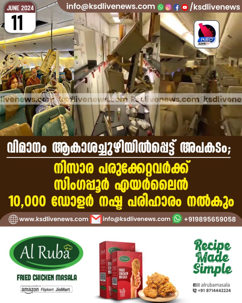വിമാനം ആകാശച്ചുഴിയിൽപ്പെട്ട് അപകടം; നിസാര പരുക്കേറ്റവർക്ക് സിംഗപ്പൂർ എയർലൈൻ 10,000 ഡോളർ നഷ്ട പരിഹാരം നൽകും