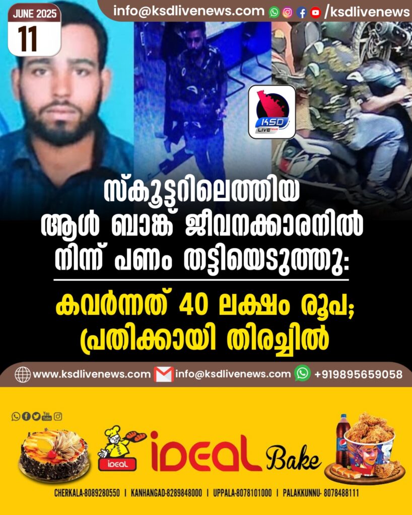സ്കൂട്ടറിലെത്തിയ ആൾ ബാങ്ക് ജീവനക്കാരനിൽ നിന്ന് പണം തട്ടിയെടുത്തു: കവർന്നത് 40 ലക്ഷം രൂപ; പ്രതിക്കായി തിരച്ചിൽ
