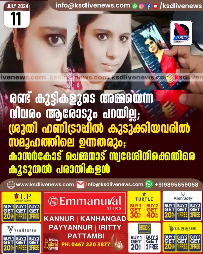 രണ്ട് കുട്ടികളുടെ അമ്മയെന്ന വിവരം ആരോടും പറയില്ല; ശ്രുതി ഹണിട്രാപ്പില് കുടുക്കിയവരില് സമൂഹത്തിലെ ഉന്നതരും; കാസർകോട് ചെമ്മനാട് സ്വദേശിനിക്കെതിരെ കൂടുതല് പരാതികള്