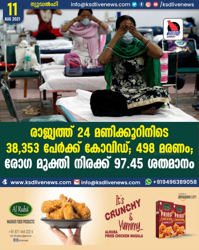 രാജ്യത്ത് 24 മണിക്കൂറിനിടെ 38,353 പേർക്ക് കോവിഡ്; 498 മരണം; രോഗ മുക്തി നിരക്ക് 97.45 ശതമാനം
