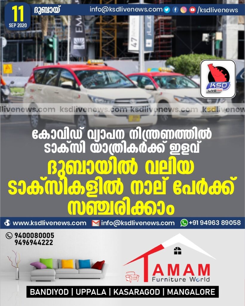 ദുബായ്: കൊവിഡ് വ്യാപനത്തിന്റെ ഭാഗമായി ടാക്‌സി യാത്രികര്‍ക്ക് ഏര്‍പ്പെടുത്തിയ നിയന്ത്രണത്തില്‍ ഇളവ്. ഹല വാനുകളില്‍(ദുബായ് ടാക്‌സി) നാലുപേര്‍ക്ക് സഞ്ചരിക്കാന്‍ അനുമതി നല്‍കി. ആറ് സീറ്റുകളുള്ള ടാക്‌സികള്‍ക്ക് മാത്രമാണ് അനുമതിയുള്ളത്.