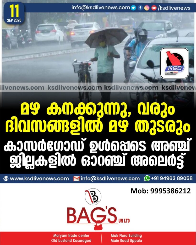 കാസർഗോഡ് ഉൾപ്പെടെ അഞ്ച് ജില്ലകളില് ഓറഞ്ച് അലെർട്ട്
