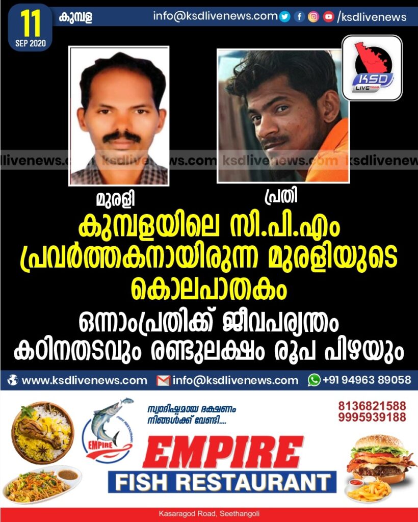 കുമ്പളയിലെ സി.പി.എം പ്രവര്ത്തകനായിരുന്ന മുരളിയുടെ കൊലപാതകം ; ഒന്നാംപ്രതിക്ക് ജീവപര്യന്തം കഠിനതടവും രണ്ടുലക്ഷം രൂപ പിഴയും