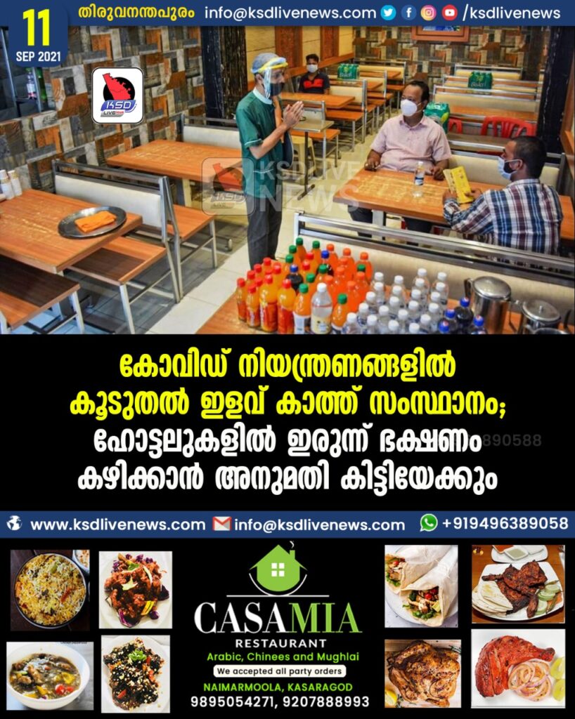 കോവിഡ് നിയന്ത്രണങ്ങളിൽ കൂടുതൽ ഇളവ് കാത്ത് സംസ്ഥാനം; ഹോട്ടലുകളിൽ ഇരുന്ന് ഭക്ഷണം കഴിക്കാൻ അനുമതി കിട്ടിയേക്കും