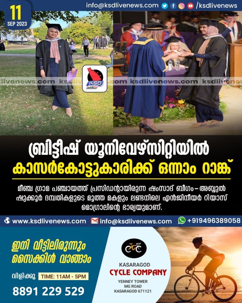 ബ്രിട്ടീഷ് യൂനിവേഴ്സിറ്റിയിൽ കാസർകോട്ടുകാരിക്ക് ഒന്നാം റാങ്ക്
