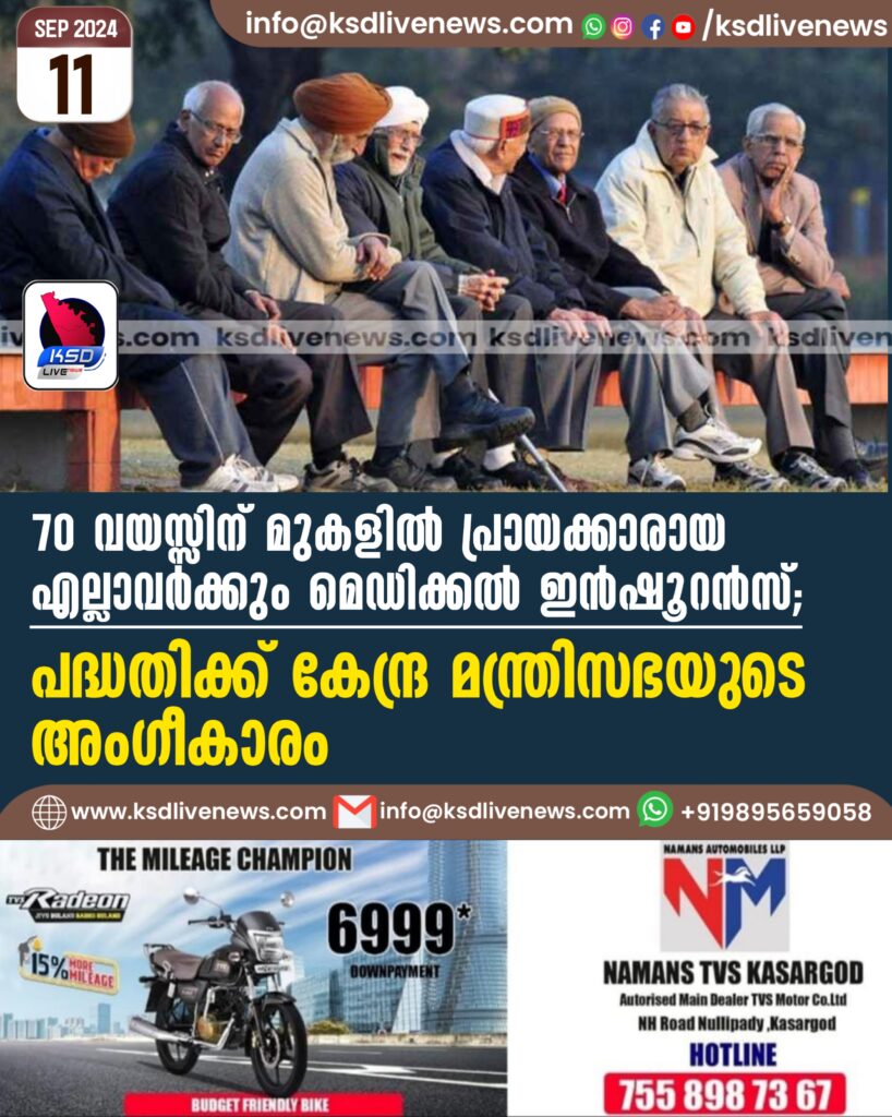 സാമ്ബത്തിക പശ്ചാത്തലം നോക്കാതെ 70 വയസ്സ് പിന്നിട്ട എല്ലാവർക്കും ഇൻഷൂറൻസ് ആനുകൂല്യം ലഭിക്കും. പ്രധാനമന്ത്രി നരേന്ദ്ര മോദിയുടെ അധ്യക്ഷതയില്‍ ചേർന്ന കേന്ദ്ര മന്ത്രിസഭാ യോഗമാണ് ഇതുസംബന്ധിച്ച്‌ തീരുമാനമെടുത്തത്.