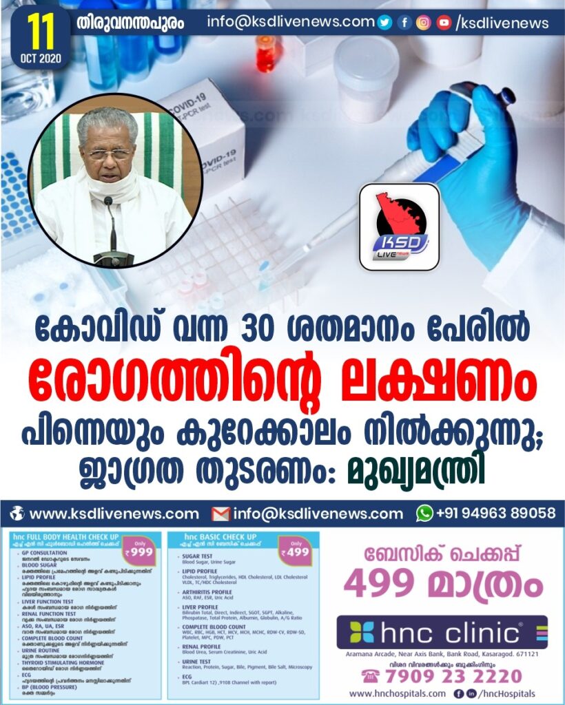 കോവിഡ് വന്ന 30 ശതമാനം പേരിൽ രോഗത്തിന്റെ ലക്ഷണം പിന്നെയും കുറേക്കാലം നിൽക്കുന്നു ; ജാഗ്രത തുടരണം : മുഖ്യമന്ത്രി