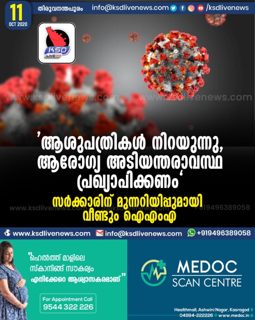 ‘ആശുപത്രികൾ നിറയുന്നു, ആരോഗ്യ അടിയന്തരാവസ്ഥ പ്രഖ്യാപിക്കണം” സർക്കാരിന് മുന്നറിയിപ്പുമായി വീണ്ടും ഐഎംഎ