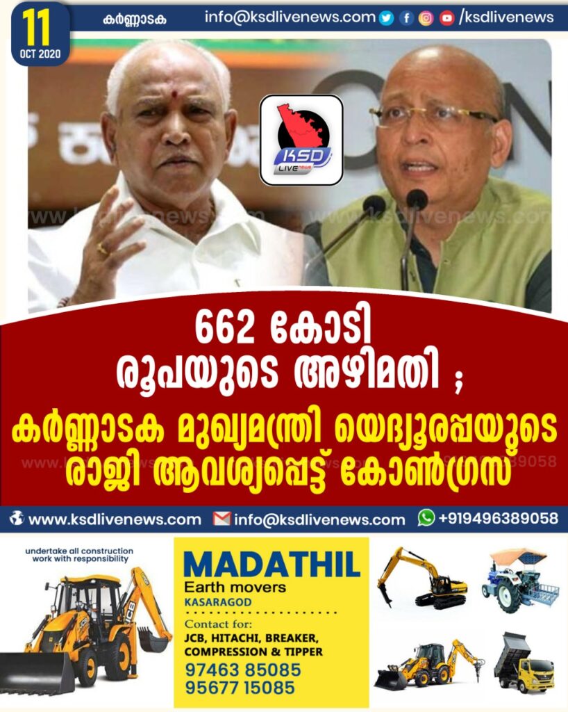 662 കോടി രൂപയുടെ അഴിമതി ; കർണ്ണാടക മുഖ്യമന്ത്രി യെദ്യൂരപ്പയുടെ രാജി ആവശ്യപ്പെട്ട് കോൺഗ്രസ്