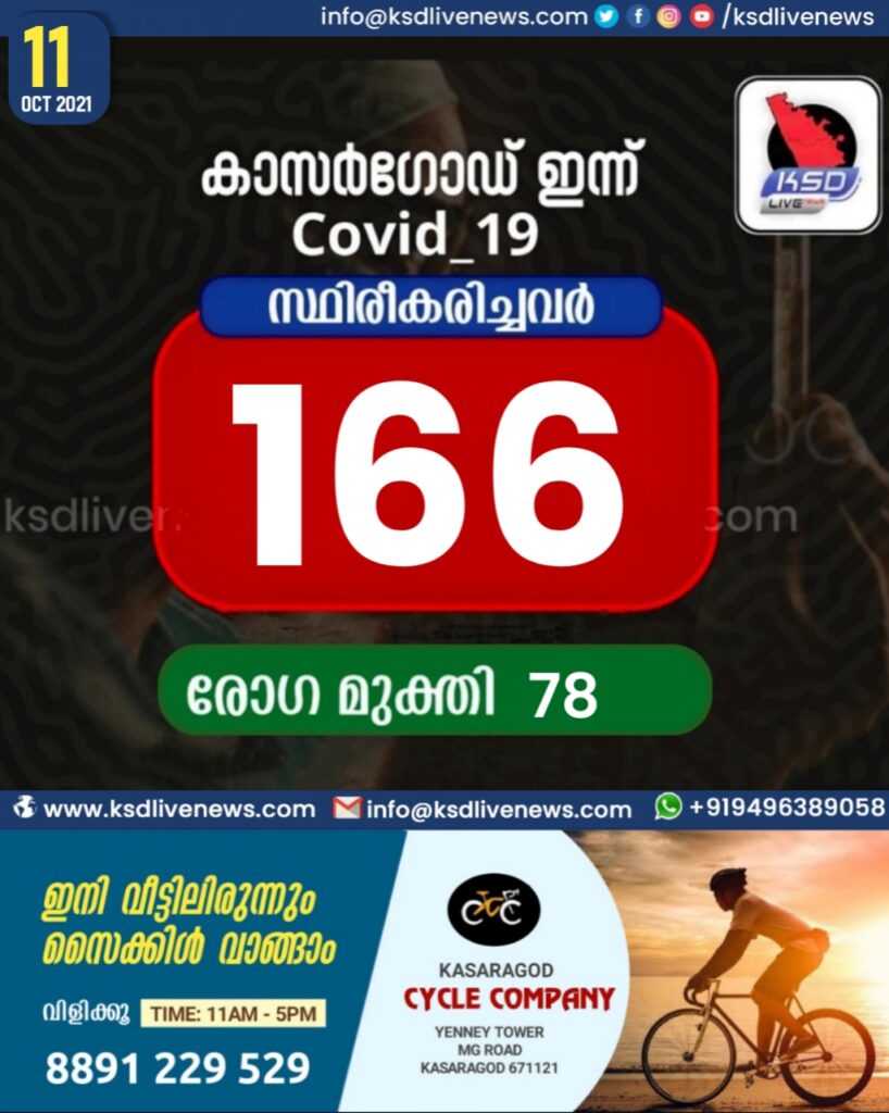 കാസര്കോട് ജില്ലയില 166 പേര് കൂടി കോവിഡ് 19 പോസിറ്റീവായി. ചികിത്സയിലുണ്ടായിരുന്ന 78