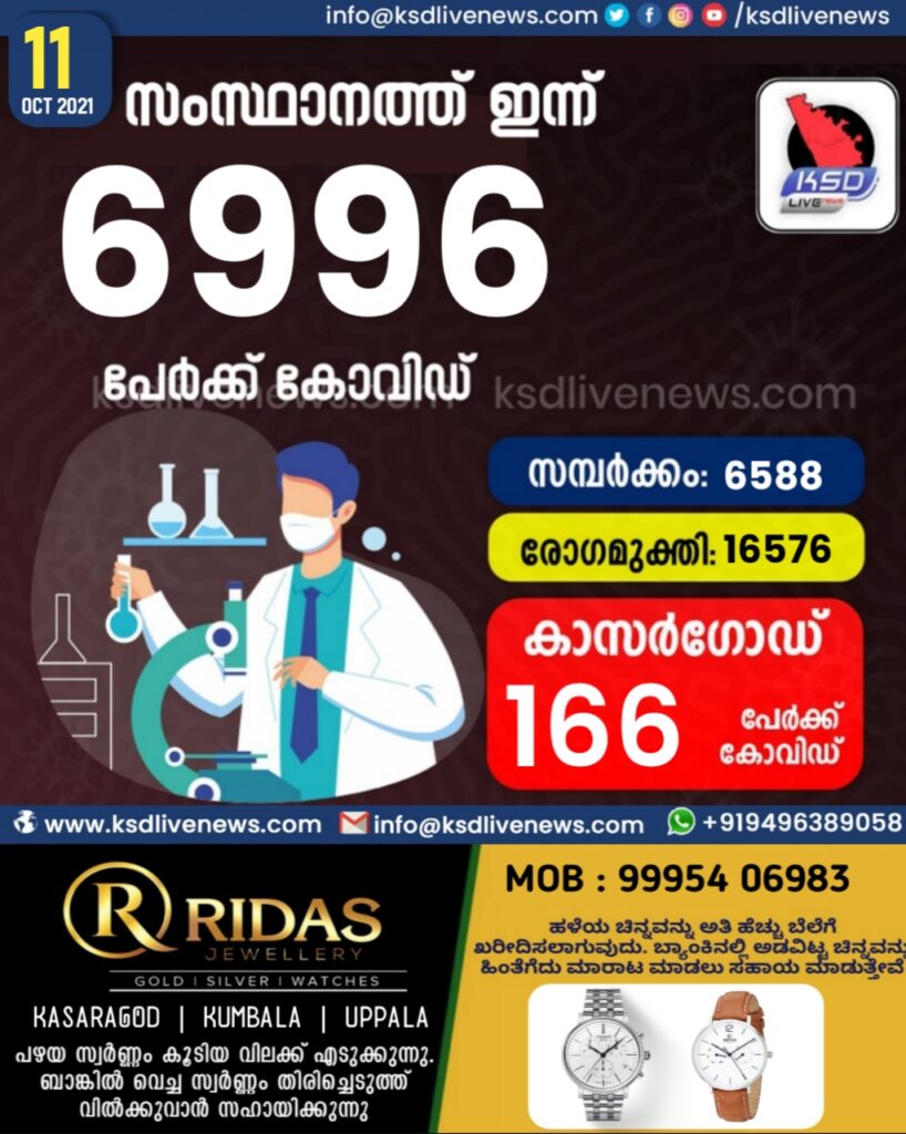 സംസ്ഥാനത്ത് ഇന്ന് 6996 പേർക്ക് കോവിഡ് സ്ഥിരീകരിച്ചു. സമ്പർക്കം വഴി 6588 പേർക്കും ; ആശ്വാസമായി 16576 പേർക്ക് രോഗ മുക്തിയും ; കാസർഗോഡ് ജില്ലയിൽ 155 പേർക്ക് പുതിയ 166 കേസുകൾ ; മരണം 84